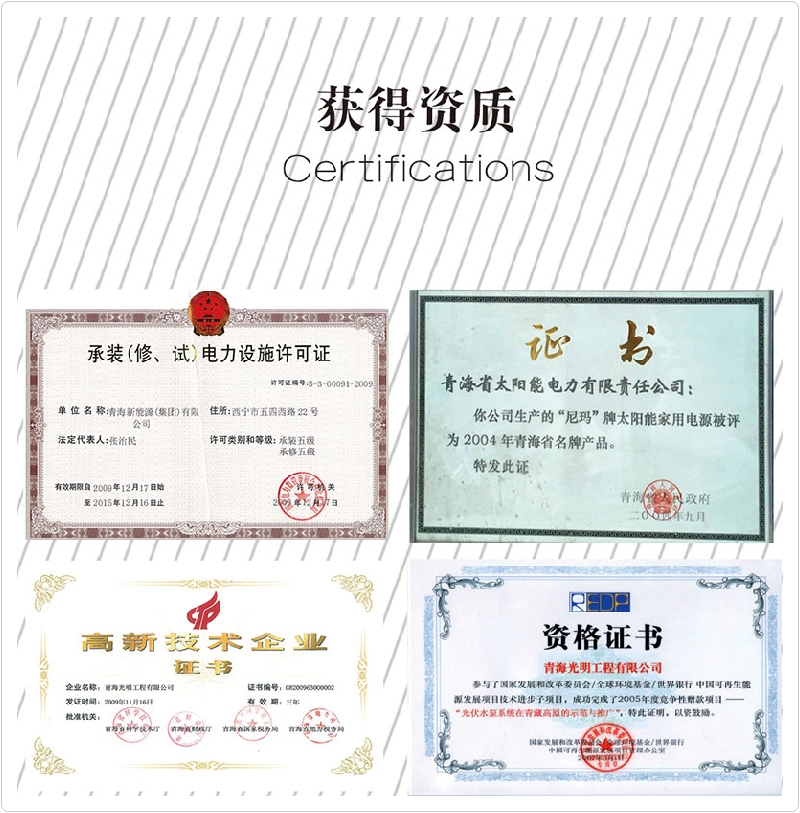公司先后榮獲“全國(guó)專(zhuān)利先進(jìn)科技研究院”、“全國(guó)各族青年團(tuán)結(jié)進(jìn)步集體”、“青年文明號(hào)”,“青海省模范集體”,“全國(guó)教科文衛(wèi)系統(tǒng)先進(jìn)工會(huì)組織”、全省“學(xué)習(xí)型組織標(biāo)兵”單位、全國(guó)“創(chuàng)新性試點(diǎn)企業(yè)”、連續(xù)三年被中國(guó)農(nóng)業(yè)銀行青海分行授予“AAA信用企業(yè)”和“AAA優(yōu)良客戶”等榮譽(yù)稱(chēng)號(hào)。公司擁有“尼瑪”牌太陽(yáng)能。